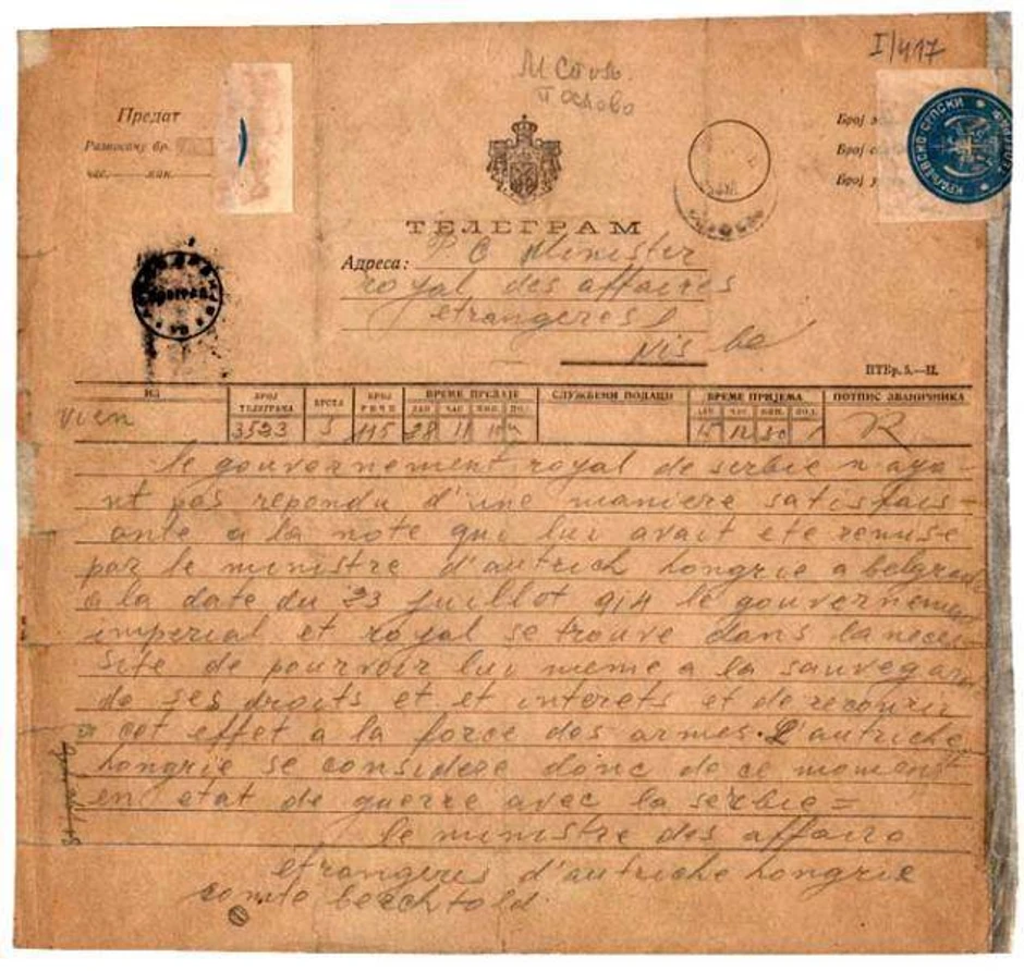 U telegramu je pisalo: "Pošto srpska kraljevska vlada nije dala povoljan odgovor na notu koju joj predao austrougarski poslanik u Beogradu, 23. jula 1914. godine, Carska i Kraljevska vlada nalazi za potrebno da sama potraži zadovoljenje svojim pravima i interesima i da radi toga pribegne sili oružja. Austro – Ugarska se smatra, dakle, da se od ovog trenutka nalazi u ratnom stanju sa Srbijom.