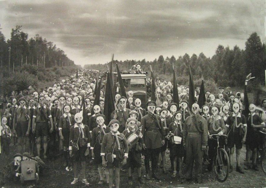 Naime, na fotografiji se nalaze mladi pioniri sovjetske Rusije, sa sve gas-maskama na licima. Fotografija je snimljena 1937. godine, tokom vežbe odbrane Lenjingrada, u kojoj su morali da učestvuju svi, čak i deca. Ova fotografija sada izgelda veoma zastrašujuće, ali je u to vreme trebalo da predstavlja snagu, efikasnost i spremnost mladih Rusa da odbrane zemlju od eventualnog agresora.