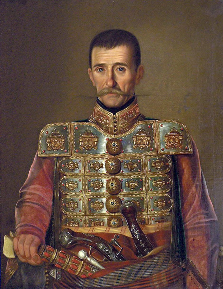 Uzun Mirko Apostolović odevao se u crvenu dolamu s tokama preko nje, koje su se sastojale iz dvadeset ploča.