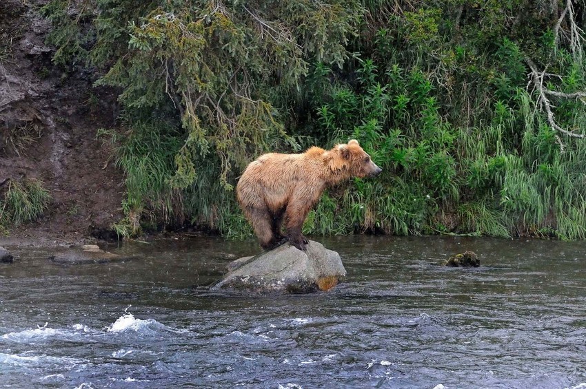 Grizli je zauzeo poziciju na jednoj steni koja štrči iz vode i strpljivo čekao da se pojavi riba.
