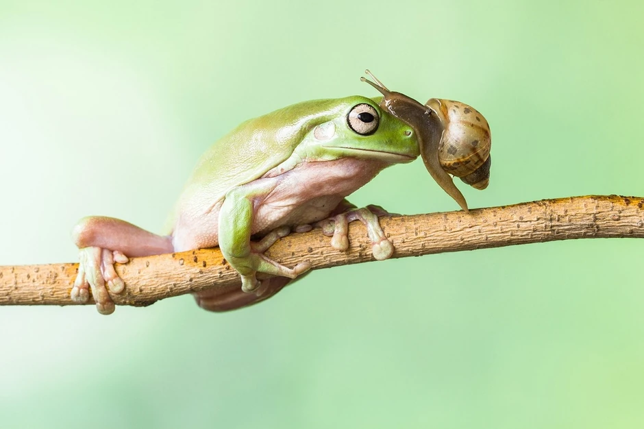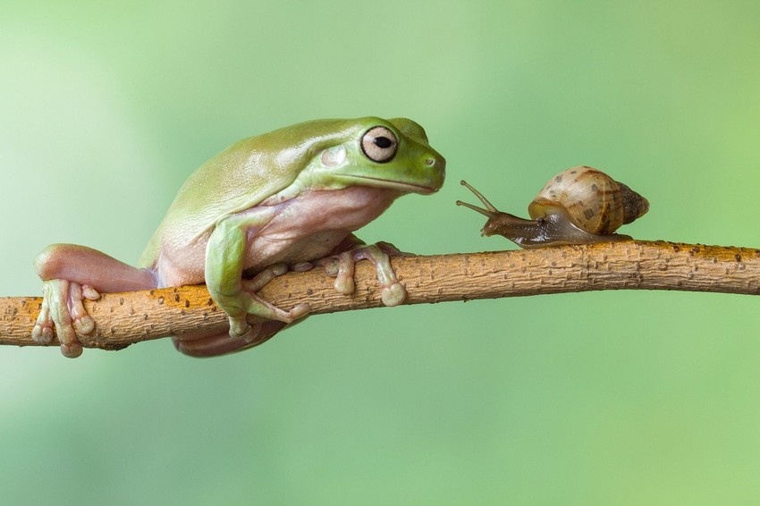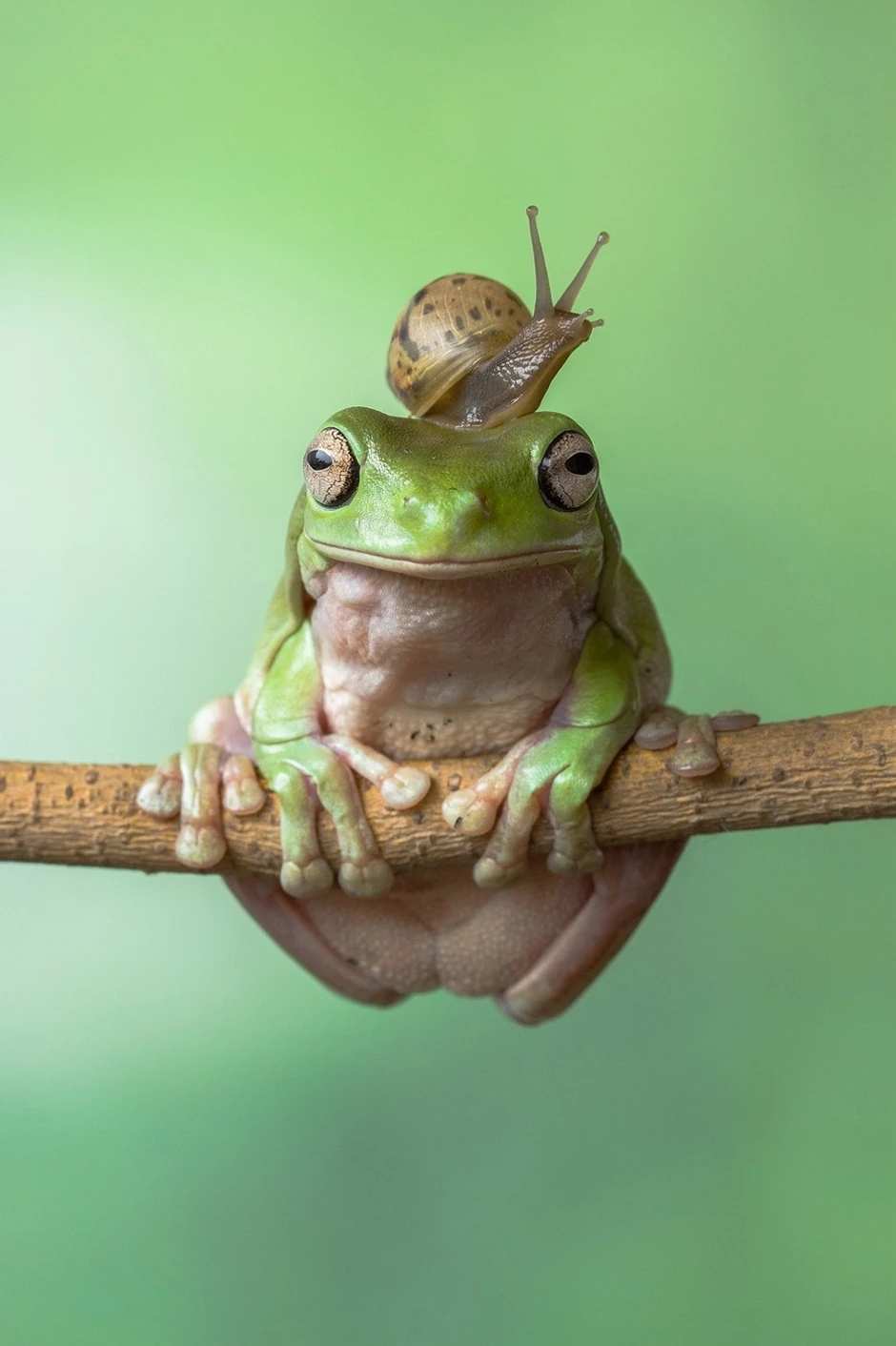 Puž je rešio da se popne žabi na glavu, a njoj to, čini se nije uopšte smetalo.