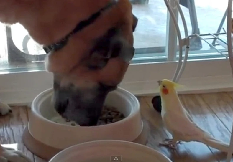 Tako ovaj pas svakoga dana uz obrok dobije i serenadu gratis, a njegov pernati prijatelj zadovoljan je što ima tako vernog slušaoca.