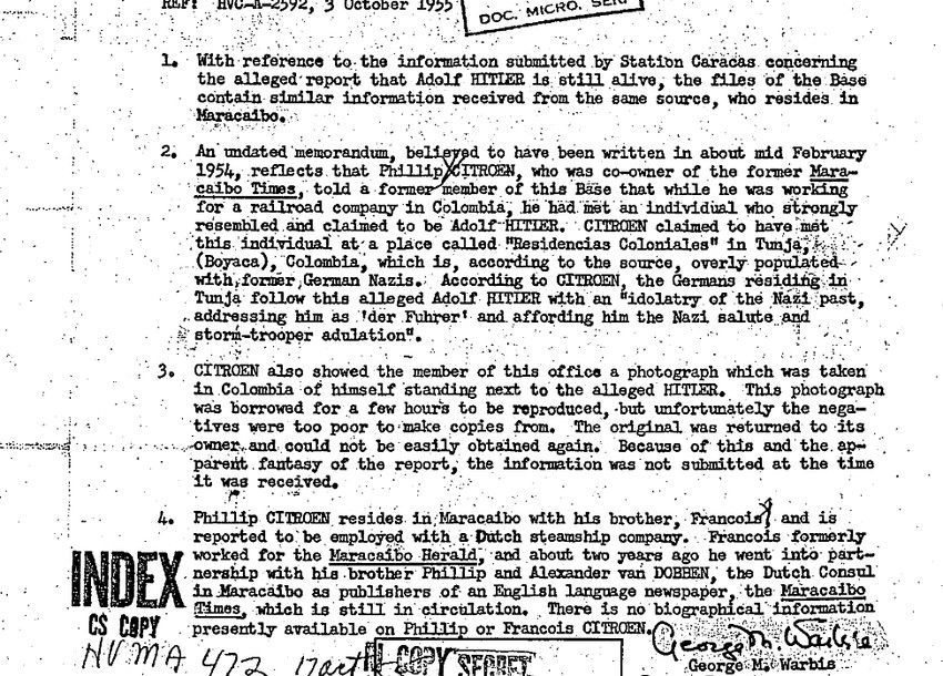 Naime, dokument koji je potpisao šrf kancelarije CIA u Karakasu u Venecueli, David Brikson, potpisan je u Vašingtonu 1955. godine zajedno sa fotografijom na kojoj je navodno Adolf Hitler sa "vrlo pouzdanim" izvorom CIA - Sitroenom. U dokumentu piše da je fotografija snimljena "ne tako davno".