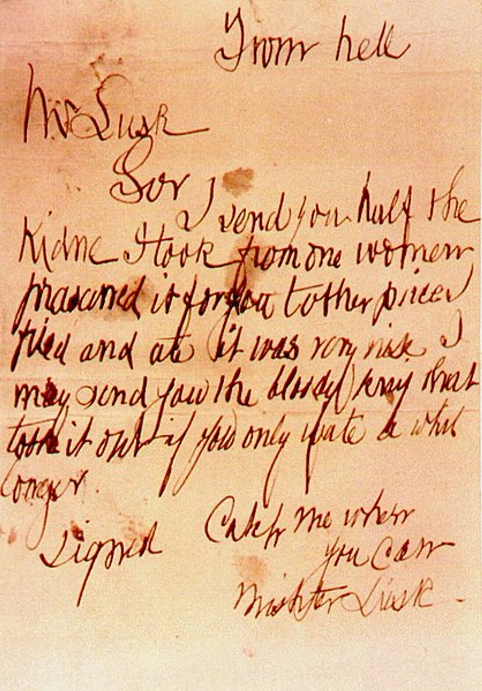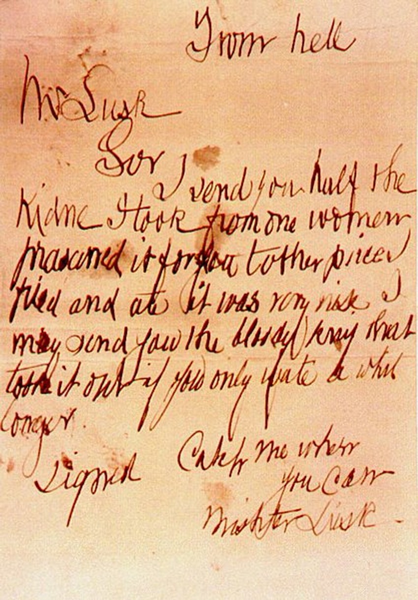 Pismo koje je napisano crvenim mastilom i počinje sa "Dragi šefe" stiglo je u Centralnu novinsku agenciju u Londonu 27. septembra 1888. godine, a koje su oni prosledili Skotland jardu. I razglednica koja je potpisana sa "Drski Džeki" takođe je stigla u Centralnu novinsku agenciju, nekoliko dana kasnije.