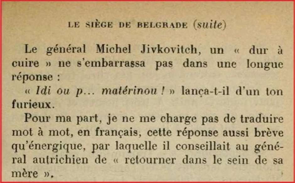 "Što se mene tiče, neću se truditi da prevodim na francuski reč po reč taj odgovor, koliko kratak, toliko energičan, kojim je on savetovao austrijskom generalu da se "vrati u utrobu svoje majke". Zatim, kada je neprijateljski pregovarač, strašno zabezeknut ovim odgovorom, stigao do mađarske obale, general Živković, koji je nastavio da sipa druge psovke – srpski jezik je njima obilno opskrbljen – naredio je artiljeriji da odmah otvori strahovitu vatru", zapisao jeAnri Barbi.