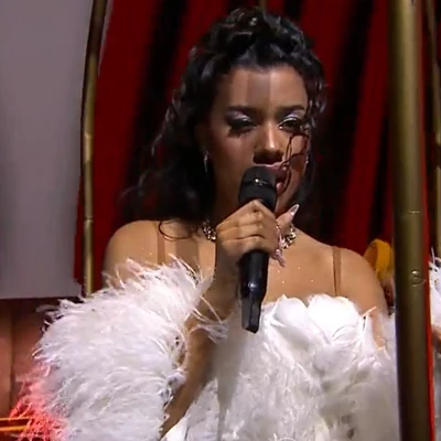1 kom. PEVAČICA PRŠTI OD GLAMURA U HALJINI OD PERJA Kat Dosa rođena je u Južnoj Africi, a večeras nastupa na "Beoviziji 2024": "VOLIM SARME I PEČENJE" (Video)