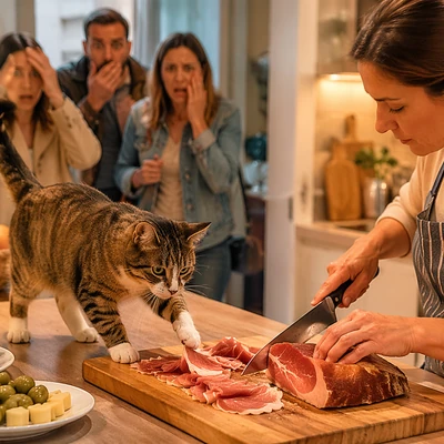 1 kom. Mačka skače na kuhinjsku radnu površinu dok domaćica seče meze: Otišli u goste pa se zgrozili - "A tek peškir koji nije promenjen od Božića..."
