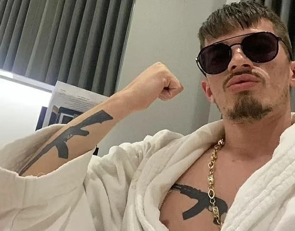 Influenser, koji ima tetovaže AK-47 na grudima i desnoj ruci, vidi se na drugoj fotografiji kako nosi majicu Čelsija ispred crvenog Audija.