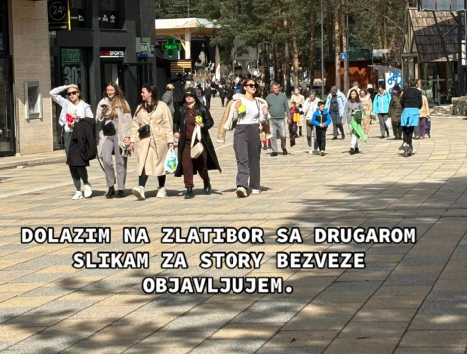 "Dolazim na Zlatibor sa drugarom, slikam za stori, bezveze objavljujem. Provodimo dva sata na Torniku i krećemo da se vraćamo gondolom u centar. Na prvoj stanici pet devojaka pita da li mogu da uđu sa nama, upoznamo se, slikamo i ovu sliku takođe stavim na stori, da bih onda ubrzo shvatio... ", napisao je on u nizu svojih fotografija.