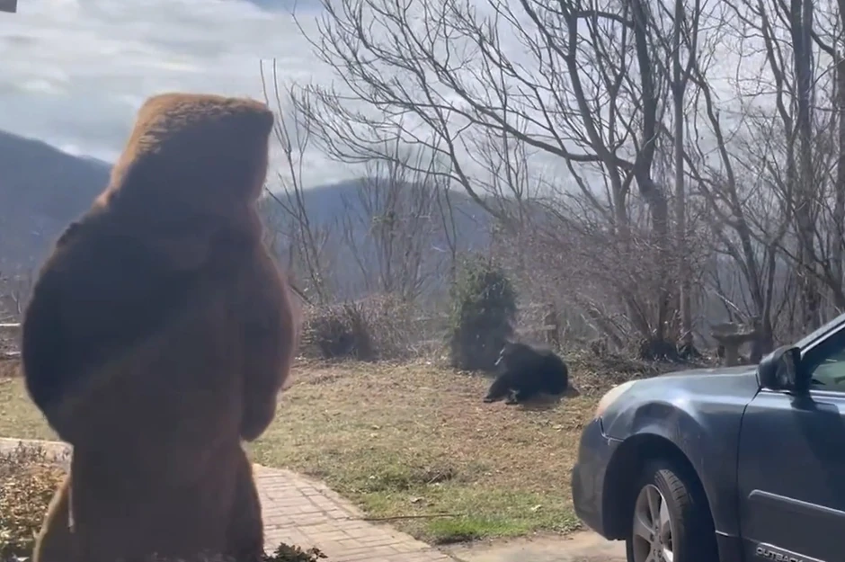 Na snimku iz Ešvila vidi se kako muškarac, obučen u smeđi kostim koji više liči na maskotu nekog koledža nego na pravog medveda, izlazi iz kuće i polako se približava divljoj životinji. Dok mu se oprezno prikrada, čak ispušta režajuće zvukove, očigledno pokušavajući da zastraši nepozvanog gosta.