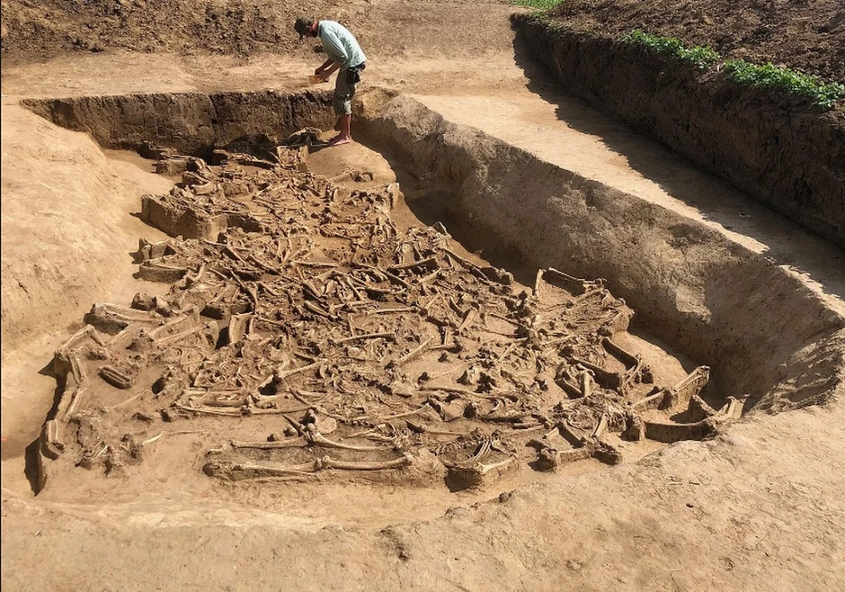 Otkrili su ostatke 38 osoba u rovu koji okružuje naselje. Njihovi dobro očuvani skeleti bili su pomešani i svima su nedostajale glave, osim jednom malom detetu.