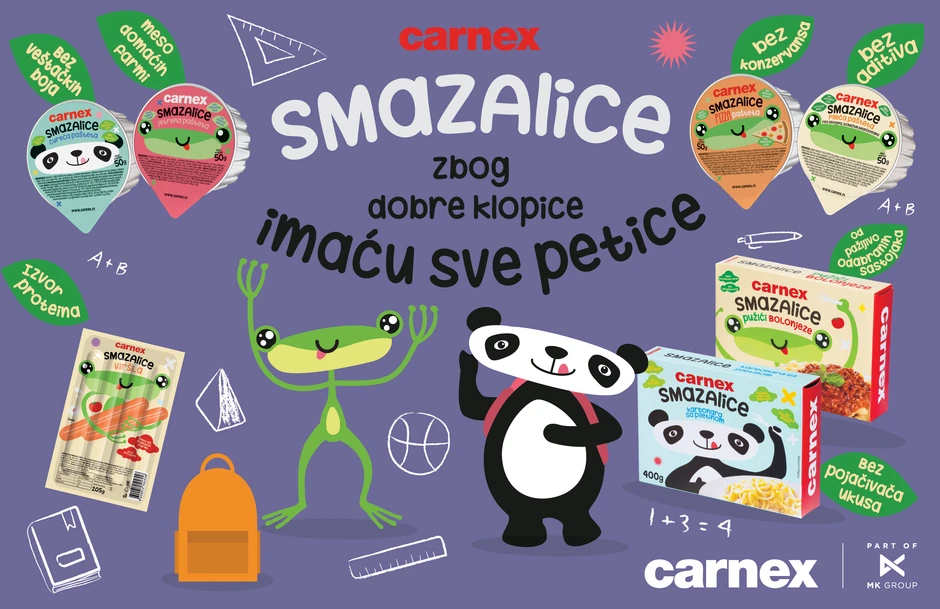 Pored Smazalice pašteta, u Carnex asortimanu specijalno namenjenom mališanima nalaze se i jela od pažljivo odabranih sastojaka Smazalice Pužići bolonjeze i Smazalice Karbonara sa piletinom, kao i Smazalice viršle, koje su sjajan izvor proteina i napravljene od mesa sa domaćih farmi. Sve u svemu, jasno je su Smazalice idealan saveznik svim mamama i tatama koji žele da svojoj deci obezbede brz, ukusan i zdrav obrok, čak i kada nisu kod kuće.