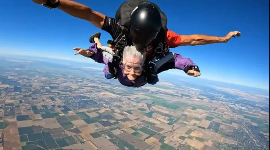 Širli Tuter iz Danigena, Kalifornija, proslavila je svoj 90. rođendan na spektakularan način – skakanjem padobranom sa visine od 3.962 metara.
