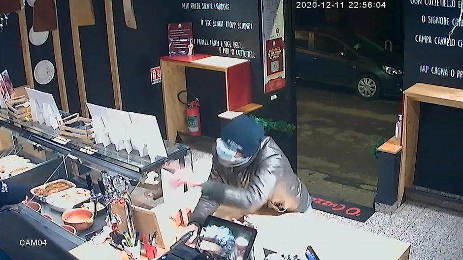 Misteriozni lopov opljačkao je prodavnicu brze hrane u Italiji noseći u ruci pištolj i imajući dve maske na licu.