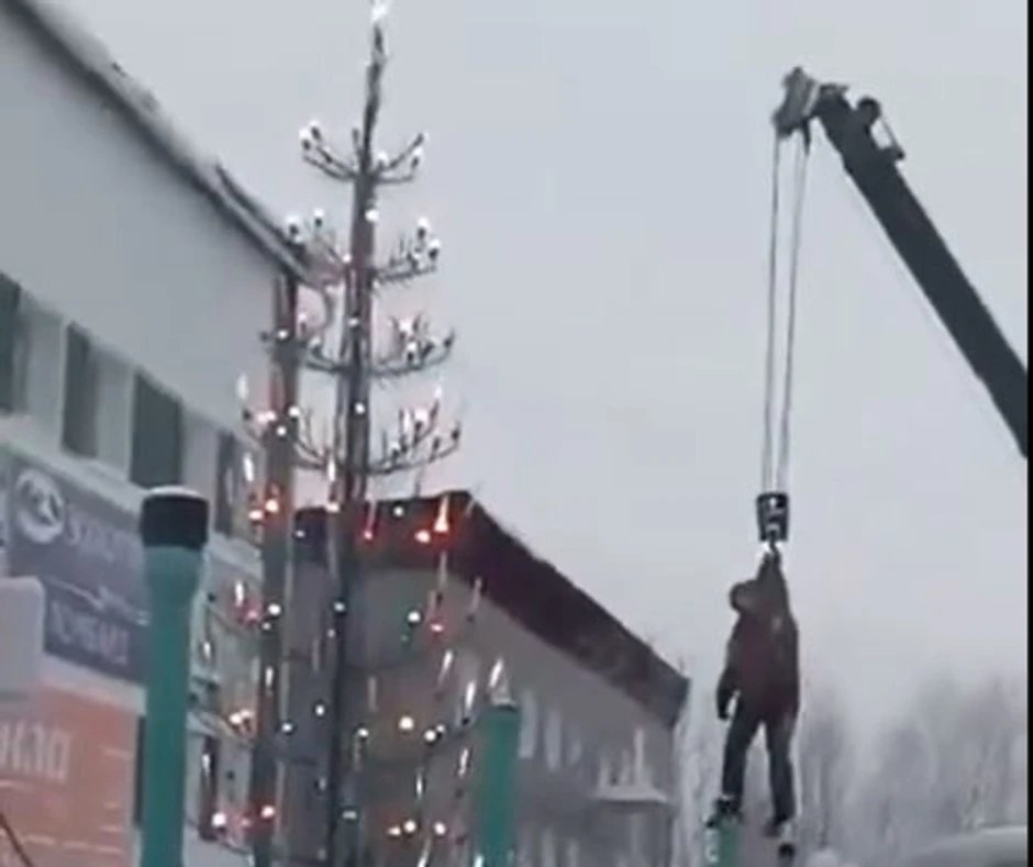 Na društvenoj mreži Tviter pojavio se bizarni snimak nastao navodno pre nekoliko dana u Jakutiji, a na kojem se vidi kako čovek zakačen za kabl, uz pomoć sajle i dizalice, zakačen samo oko struka, kiti jelku ispred jednog od marketa.