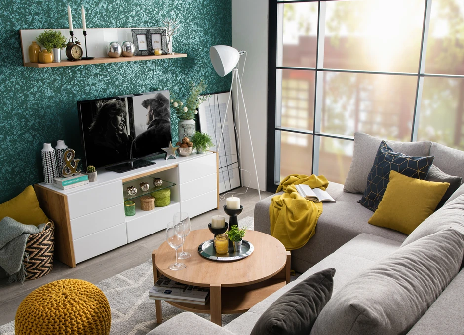 Što se nameštaja tiče, uz zelenu se najbolje slažu neutralni, monohromatski tonovi, ali i sve zemljane nijanse. Recimo, kombinacija drvo dekora i zelenih nijansi u dnevnom boravku učiniće da imate osećaj kao da se nalazite u prirodi. Za moderan ambijent odlično rešenje predstavlja udobna siva ugaona garnitura TOLEDO, koja može da se pretvori u ležaj, u kombinaciji sa praktičnim elementima u toplim nijansama artisan hrasta kakvi su klub sto TOBAGO, TV polica ALICIA i zidna polica MOLISE.