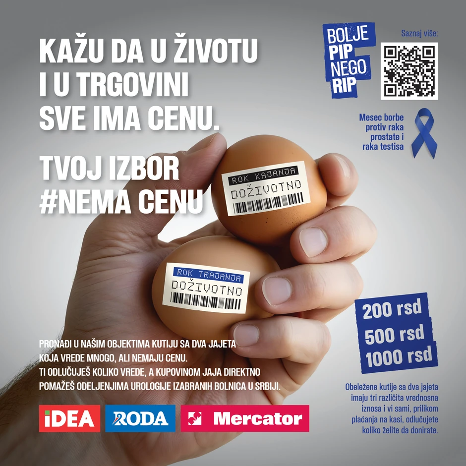 Tokom trajanja kampanje, od 28. novembra do 31. decembra, u 20 odabranih IDEA, Roda i Mercator prodavnica širom Srbije potrošači imaju priliku da podrže akciju kupovinom kutije sa dva jaja koja vrede mnogo, ali nemaju cenu. Kutije sa jajima dostupne su u 3 ponuđene opcije, a vrednosni iznos odabraće sami kupci. Sav prihod od prodaje biće doniran urološkim odeljenjima odabranih bolnica u Srbiji.