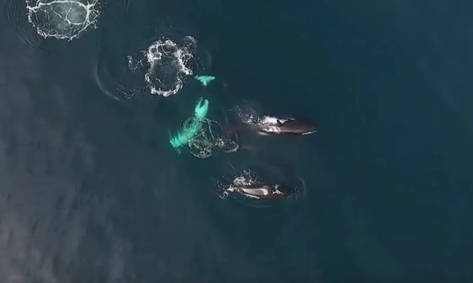 Fotograf Slejter Mur je uspeo dronom da snimi četiri orke, dve ženke i dva madunca dok okružuju morksog psa u uvali u Montereju.