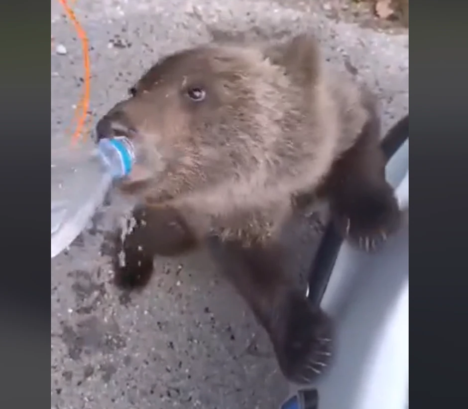 Prijateljski nastrojeni prišli su medvedu koji je očigledno shvatio da su oni tu samo da pomognu. Popio je flašu vode a onda nastavio svojim putem.