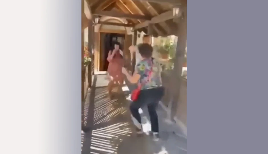 U jednom trenutku, ona je ipak odlučila da ode iz bašte restorana gde se sve odvijalo. Tom prilikom, nogama je izgazila crvene lakovane sandale na štiklu koje su stajale na podu, a koje su pripadale ženi koja je pretrpela batine.