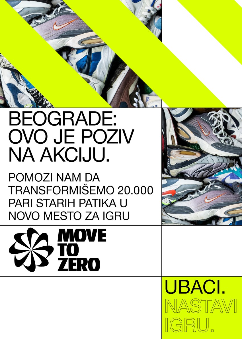NIKE kontejneri za skupljanje patika od danas se nalaze po čitavom gradu, a svoje stare patike možete donirati u Nike shop-ovima u tržnim centrima Galerija, Ušće i Ada Mall, kao i na još 10 lokacija širom Beograda u Sport Vision, Buzz, Tike, Run'n More i Extra Sports radnjama. Prikupljene patike će se reciklirati i od njih će se napraviti podloga za novi košarkaški teren i dečije igralište. Pored same podloge, teren i igralište biće u potpunosti renovirani na jesen ove godine.