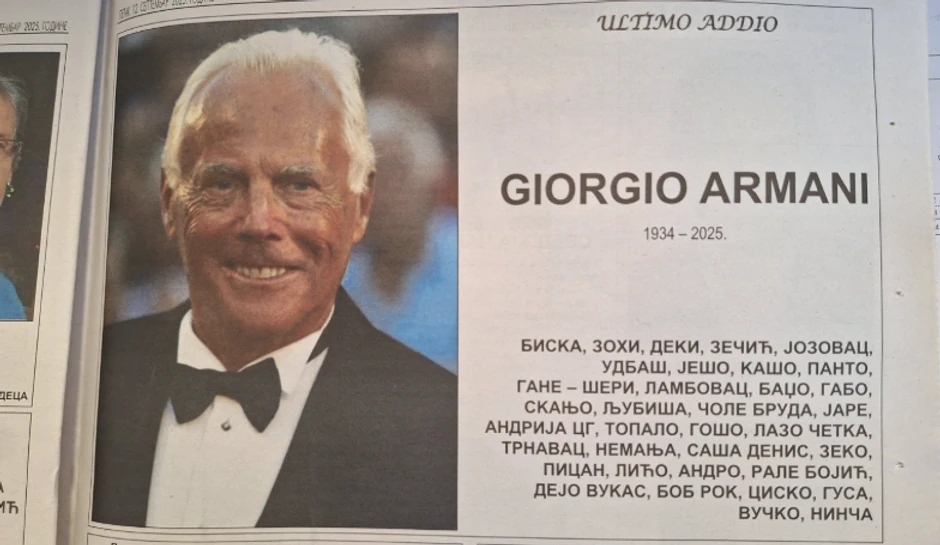 Objavljena čitulja slavnom modnom kreatoru Đorđu Armaniju u "Čačanskom glasu"