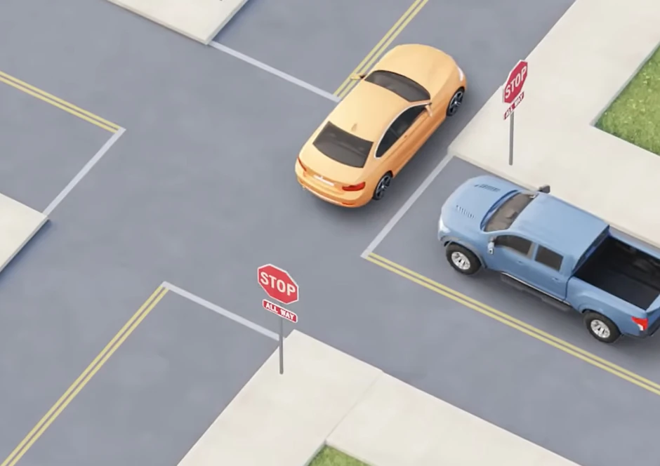 U konkretnom slučaju na ilustraciji nalaze se tri vozila koja dolaze na raskrsnicu i moraju da se zaustave zbog znaka STOP, nakon čega na snagu stupa osnovno saobraćajno pravilo — pravilo desne strane. Prema tom pravilu, vozač mora da propusti vozilo koje dolazi sa njegove desne strane, dok prednost ima onaj kome sa desne strane ne dolazi nijedno vozilo.
