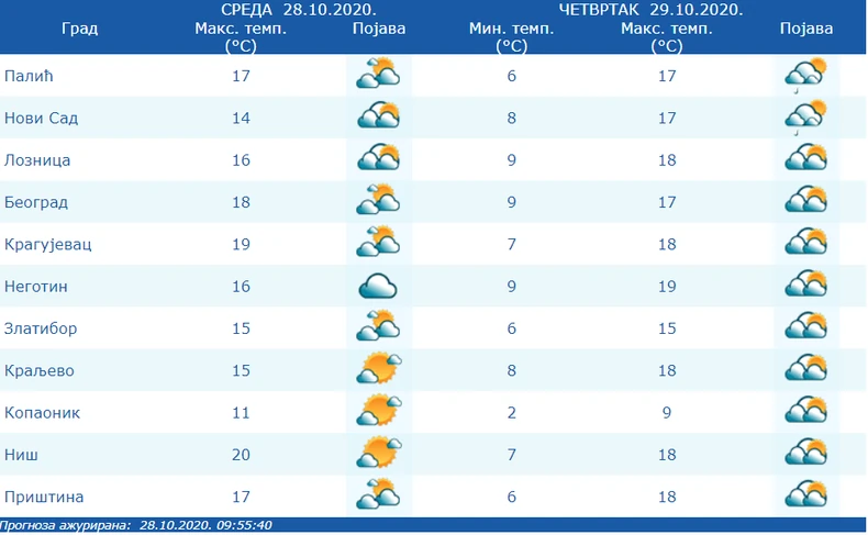 Prvi dan vikenda i poslednji dan oktobra nastaviće istim ritmom - pretežno oblačno, povremeno sa kišom i uglavnom umerenim vetrom, dok se u nekim krajevima očekuje i severozapadni vetar jačeg intenziteta. Minimalne dnevne temperature biće od 6 stepeni na Zlatiboru do 10 u Beogradu. Najviše dnevne kretaće se između 15 i 18 stepeni.