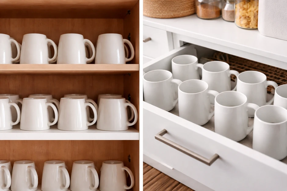 S druge strane, čuvanje šolja naopako ima svoje prednosti, naročito na otvorenim policama ili kuhinjskim površinama gde prašina može dospeti unutra.