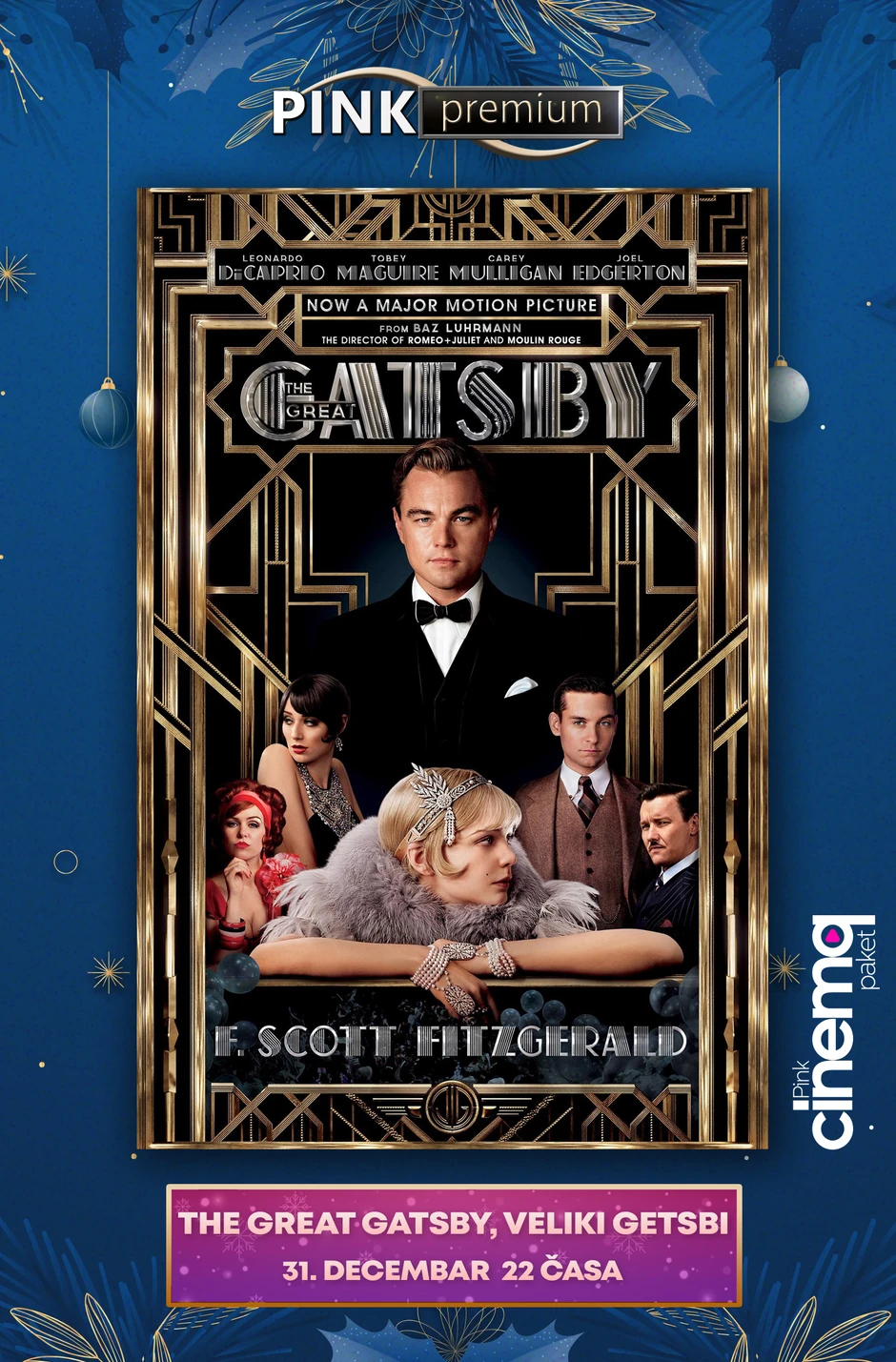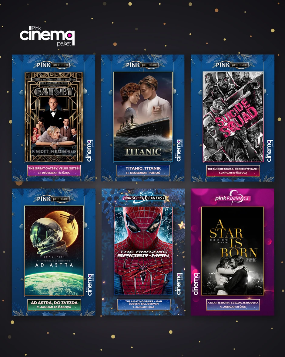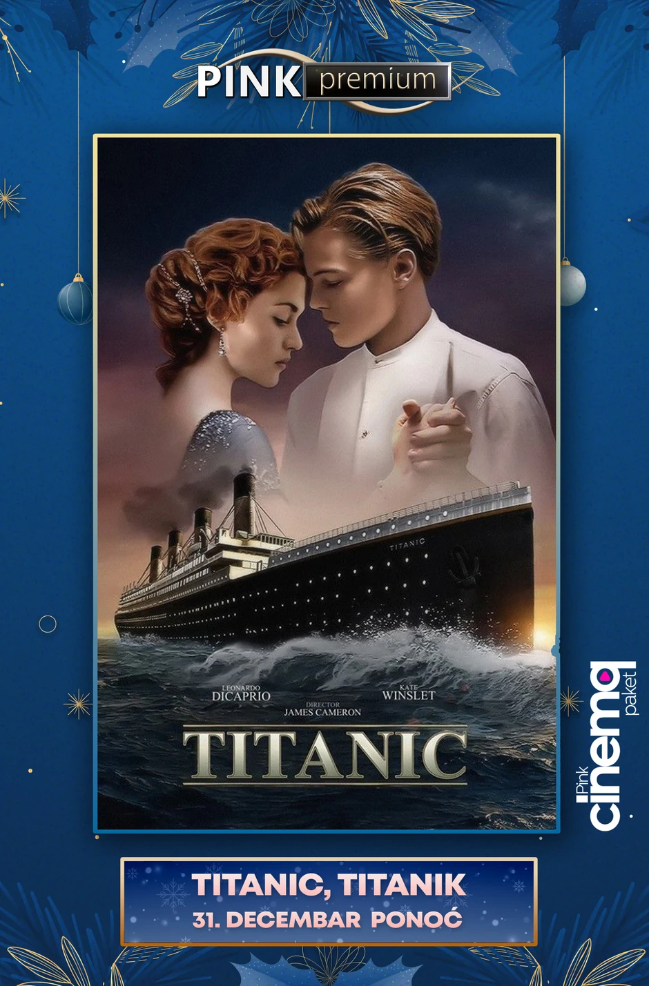 PINK PREMIUM sa zadovoljstvom 31. decembra predstavlja holivudski hit “Veliki Getsbi“ u 22 časa, kao maestralni „Titanik“ tačno u ponoć. Zagrejavanje za najsjajniju noć svakako je prava stvar uz ova dva Oskarom ovenčana ostvarenja u kojima je Lionardo Di Kaprio briljirao i doprineo utisku da se i danas gledaju sa istim žarom kao i u godinama kada su tek izašli na bioskopsko platno.