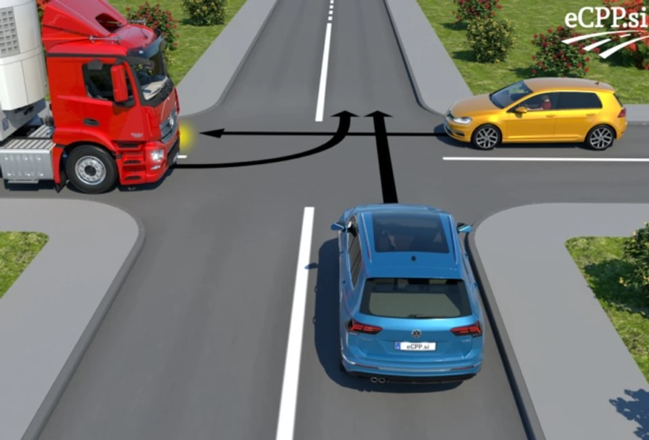 Dilema je nastala oko toga ko ima prednost: žuti i plavi automobil idu pravo, kamion skreće ulevo