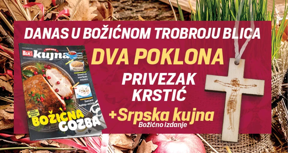 U susret najvećem hrišćanskom prazniku, Božiću, "Blic" vam danas poklanja drveni krstić privezak sa likom Isusa Hrista, simbola hrišćanstva. Uz današnje izdanje očekuje vas i novi broj "Srpske kujne" sa prazničnim receptima.