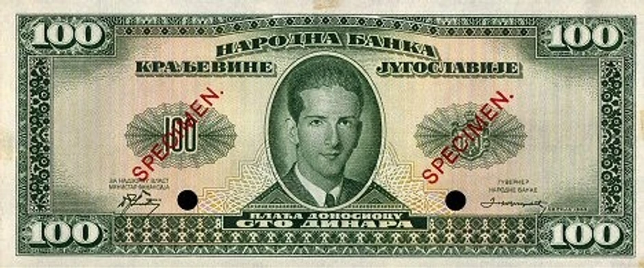 Nakon početka Drugog svetskog rata na teritoriji Kraljevine Jugoslavije i odluke da se sam vrh države, na čelu sa kraljevskom porodicom Karađorđević, skloni na sigurno u Englesku. Upravo tamo je 1943. godine, po nalogu narodne banke Kraljevine Jugosalvije štampana serija novčanica u apoenima od 5, 10, 25, 100, 500 i 1.000 dinara, a, na kojima se nalazio lik kralja Petra Drugog Karađorđevića. Nažalost, danas, nakon skoro osam decenija, nisu poznati autori ovih bankota.