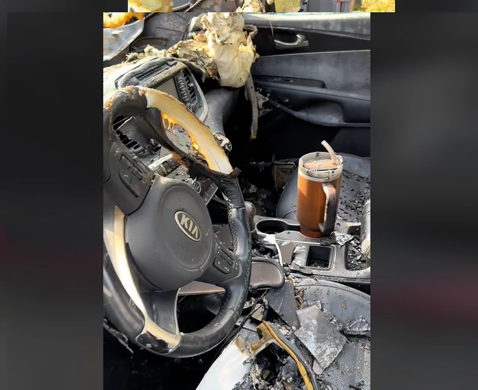 U svom videu, potresena nesrećom, snimila je unutrašnjost svog spaljenog automobila, nakon čega je uzela termos, dokazujući svima da je u on istom stanju kao i pre požara.