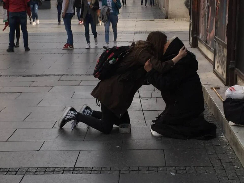 Devojčica kleči pored bake koja prosi u Knez Mihailovoj, razgovaraju neko vreme, a onda sledi - topao zagrljaj. Sve je to zabeleženo na fotografijama koje pogađaju pravo u srce.