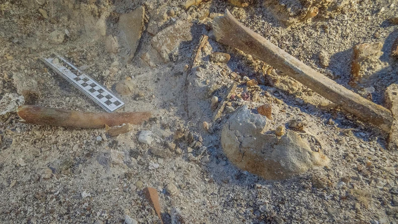 Nađene kosti bile su nabacane jedne na druge, kosti ruku ležale su na kostima nogu. Lobanja, zubi i fragmenti rebara bili su pored. Slomljena grnčarija i delovi drugih artefakata bili su razbacani okolo. Ispod naslaga je zarobljeno još kostiju, ali je rizično iskopavati ih zbog opasnosti od podvodnih klizišta.