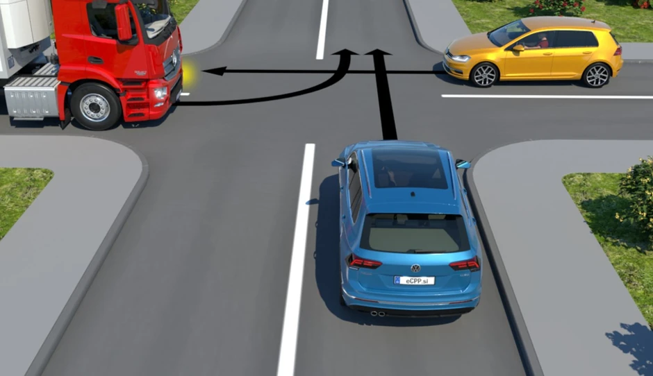 Prema prikazu, žuti i plavi automobili voze ravno, dok kamion skreće levo. Da bi se ova situacija pravilno rešila, ključno je primeniti pravilo desne ruke, jedno od osnovnih saobraćajnih pravila koja se koriste na raskrsnicama bez dodatnih signala. Ovo pravilo nalaže da vozač uvek mora da prođe vozilo koje dolazi sa njegove desne strane.