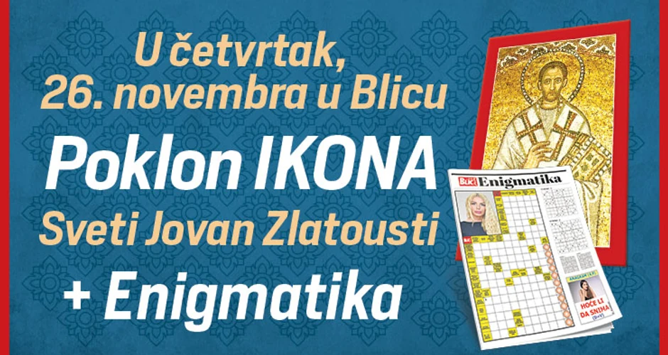 U "Blicu" sve čitaoce u četvrtak, 26. novembra, očekuju dva poklona - enigmatski dodatak na osam strana i ikona Svetog Jovana Zlatoustog, koga Srpska pravoslavna crkva i vernici tog dana i obeležavaju.
