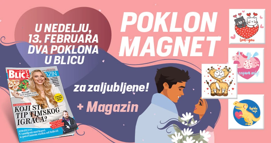 Bliži nam se Dan zaljubljenih, pa tim povodom "Blic" u nedelju 13. februara, poklanja magnete za zaljubljene koji će svakom izmamiti osmeh na licu. Uz ovaj simpatični poklon, svim čitaocima darujemo i novo izdanje Magazina za celu porodicu.