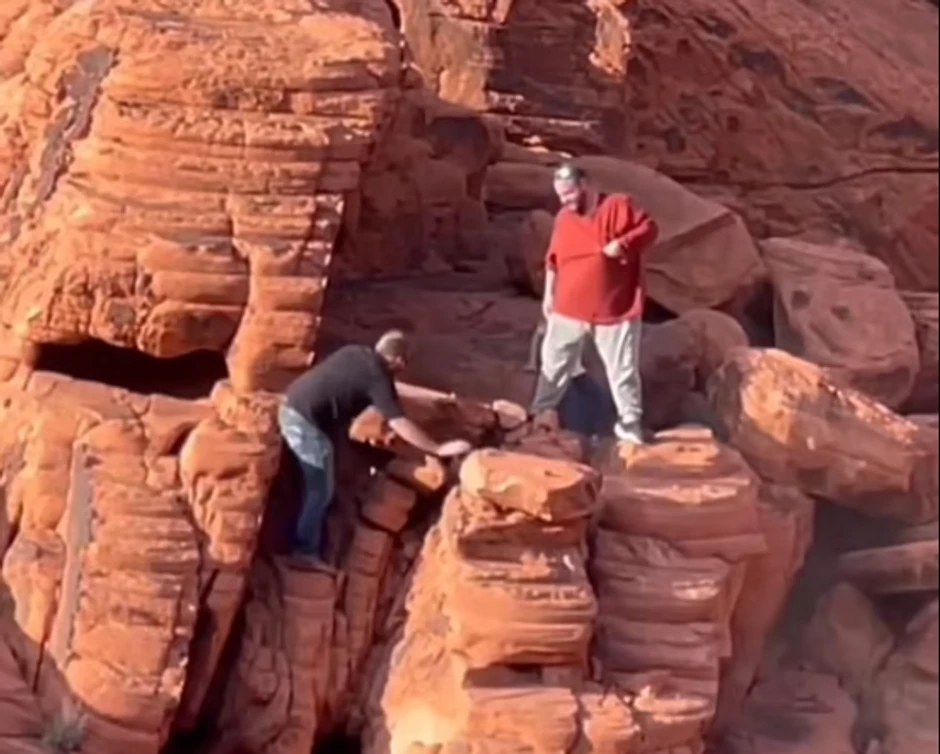 Na snimku se jasno vide dva muškarca kako se muče, ali ostaju uporni sve dok nisu odvalili jednu stenu i gurnuli je sa litice, a onda su to ponovili više puta sve vreme gledajući kako se kamenje kotrlja niz liticu usput dalje urušavajući prirodne lepote.
