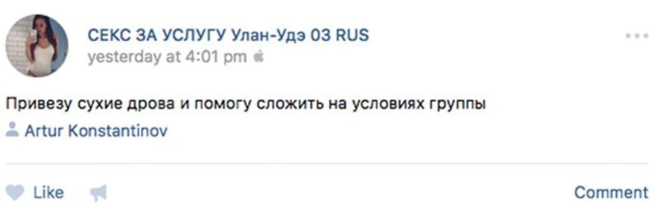 Ljudi kače statuse i nude seksualne usluge u zamenu za nov kauč, šporet ili neku popravku u kući, ili pak obrnuto, nude određene veštine (majstorske poslove, selidbe...) u zamenu za seks.