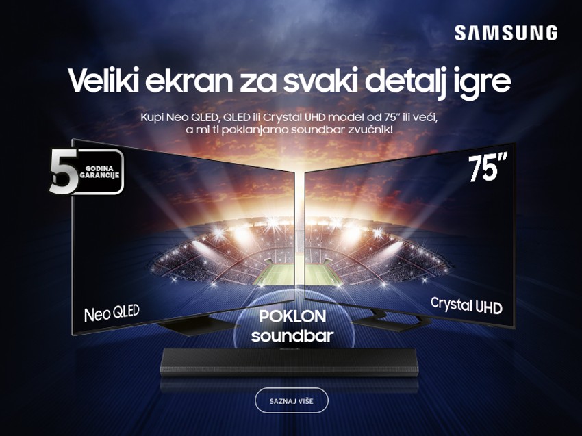 Iskoristite promotivnu ponudu gde uz kupovinu Samsung Neo QLED televizora za 2021. godinu možete dobiti i produženu garanciju u trajanju od pet godina do 30. juna 2021. Takođe, Samsung uoči velikog fudbalskog takmičenja ima akciju na velike 75’’ i 85’’ ekrane, koja traje sve do 11. jula 2021. Uz nove Neo QLED i Crystal UHD televizore na poklon se dobija i soundbar zvučnik nakon registracije kupovine na ce.promotion@samsung.com.