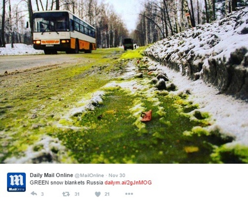 Stanovnici pokrajine Čeljabinsk bili su prilično iznenađeni kada su u sredu na ulicama ugledali zeleni sneg.