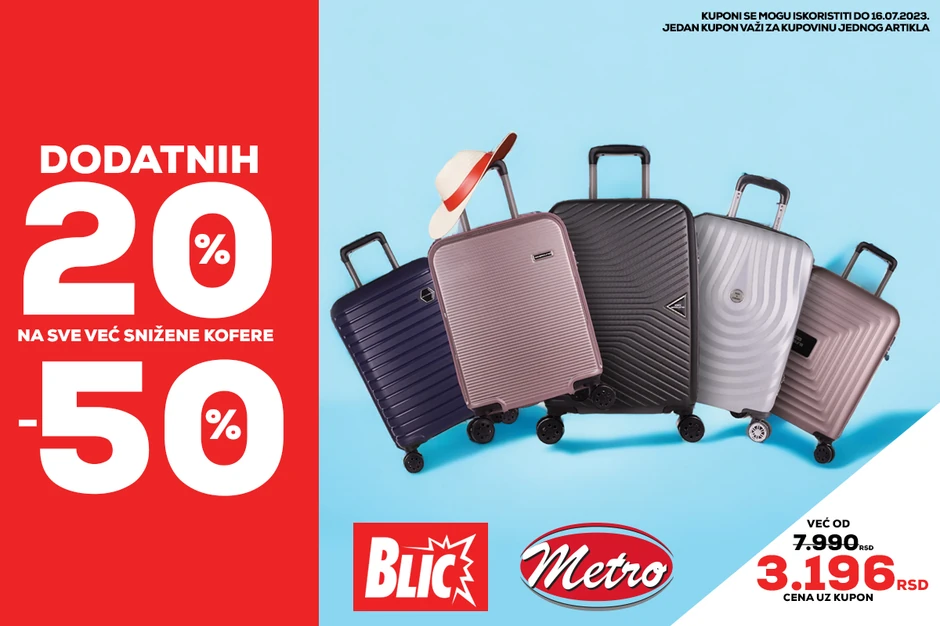 Svake godine, sada već tradicionalno „Obuća Metro” i „Blic” u letnjim mesecima svoje kupce i čitaoce redovno oraspolože sjajnom kupon-akcijom koja i te kako štedi. Ovoga puta na već snižene cene kofera od 50% uz naš zajednički kupon ostvarićete pravo na dodatnih 20% popusta.