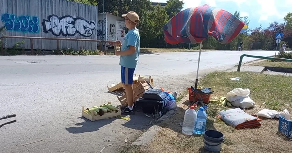 “Sveža roba” i “Domaće, domaće!” uzvikuje vozačima automobila koji prolaze kraj njega. Ispod suncobrana koji mu daje koliko toliko hlada i sa flašama vode, ovaj mališan na pošten, ali čestit način pomaže roditeljima koliko može.