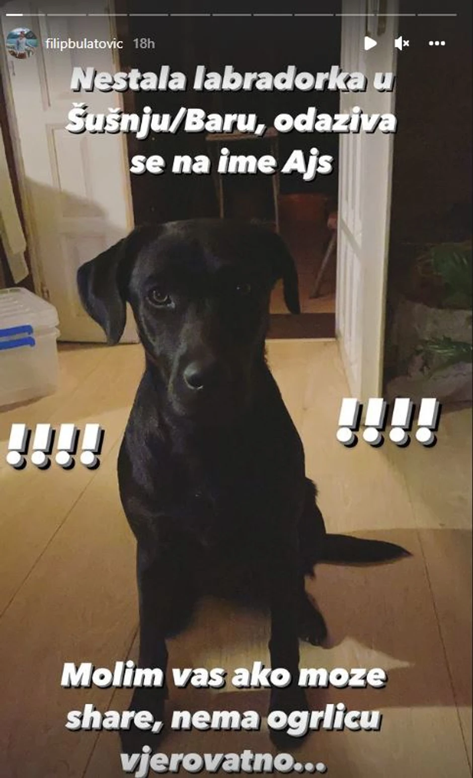 "Nestala labradorka u Šušnju/Baru, odaziva se na ime Ajs", stajalo je u prvoj Instagram objavi Bulatovića, dok je u ostaim objavama objasnio kako je do toga došlo.