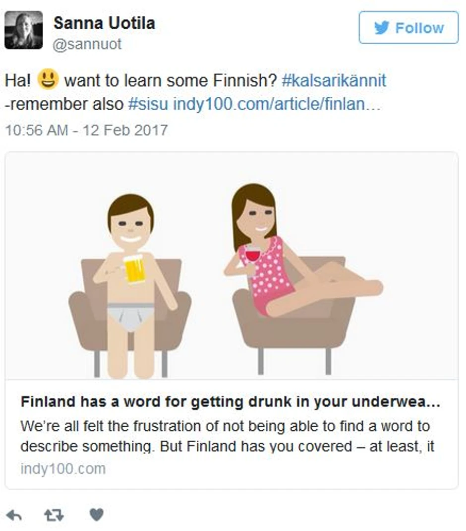 Finska je uvela novu reč u svoj vokabular. "Kalsarikännit" označava opijanje kod kuće u donjem vešu, a za ovo radnju je napravljen i poseban emotikon koji se koristi u aplikacijama za komuniciranje sa drugim ljudima.