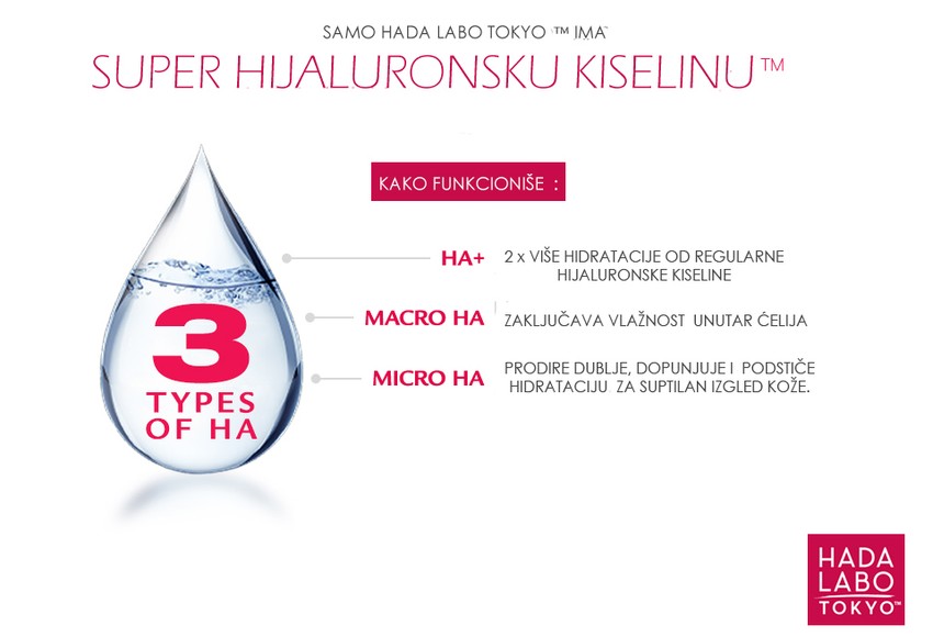 Jedan od brendova koji već nekoliko godina osvaja punu pažnju žena u Srbiji, istovremeno i najprodavaniji japanski brend za negu lica je Hada Labo Tokyo. Njihove formulacije lagane poput vode su i visoko efikasne. Svi proizvod sadrže najmanje 3 tipa Hijaluronske kiseline čime omogućavaju dubinsku hidrataciju koja traje tokom celog dana. Odmah nakon upotrebe koža lica postaje blistava i glatka.
