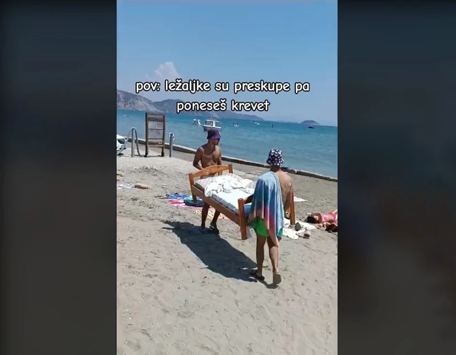 Na društvenim mrežama se često susrećemo sa komentarima nezadovoljnih srpskih turista visokim cenama ležaljki i suncobrana na popularnim plažama. Međutim, sada se pojavio hit snimak dvojice mladića iz Srbije koji su rešili da umesto plaćanja ležaljki iz smeštaja iznesu jedan krevet!