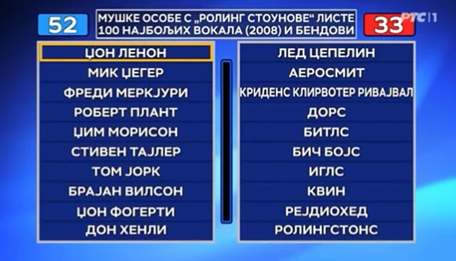 Naime, takmičari su imali zadatak da u igri spojnice povežu muške pevače sa bendovima u kojima su bili. Među nabrojanim pevačima bili su Džon Lenon, Mik Džeger, Fredi Merkjuri, Robert Plant, Brajan Vilson, Džim Morison, Stiven Tajler, Tom Jork, Džon Forgerti i Don Henli.